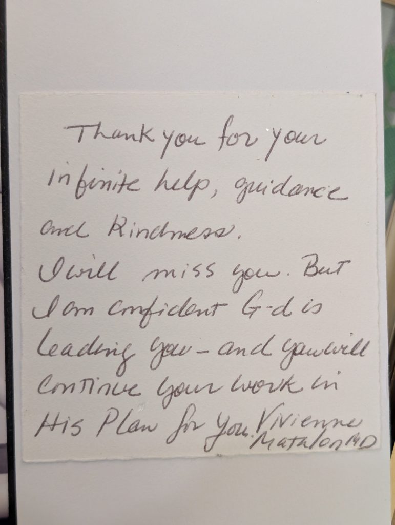 I will miss you. But I am confident G-d is leading you—and you will continue your work in His Plan for you. Vivienne Halton MD