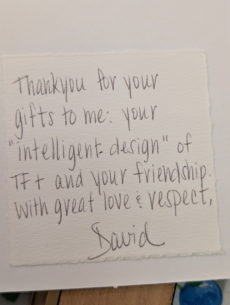Thank you for your gifts to me: your “intelligent design” of TF+ and your friendship. With great love & respect, David